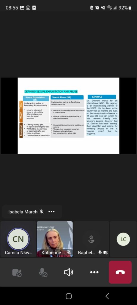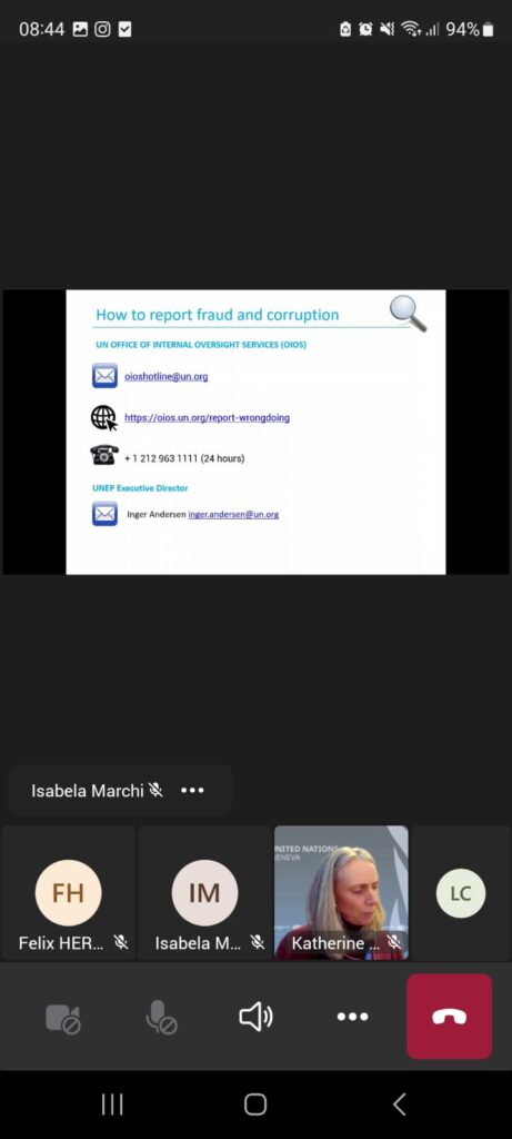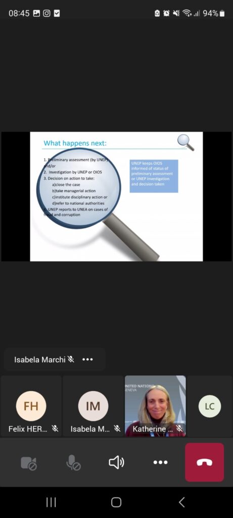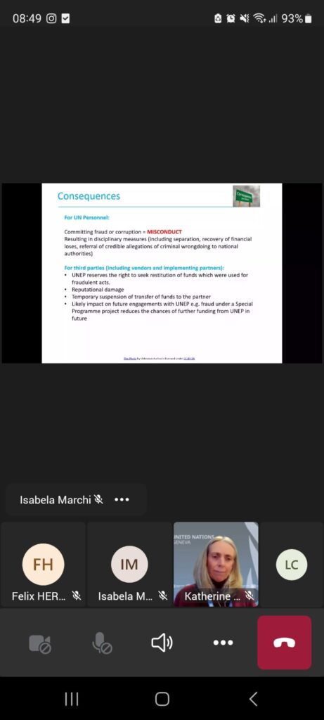 El objetivo del Webinar fue, entre otros, exponer las normas y reglamentos aplicables a las Naciones Unidas, sus políticas internas y el trabajo de la Oficina de Servicios de Supervisión Interna (OIOS) para denunciar el fraude y la corrupción y garantizar que se tomen las medidas correspondientes.